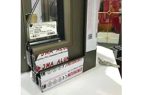 - Sử dụng nhôm JMA hệ 55 với độ dày lên đến 1.4ly cùng thiết kế khoang rỗng, nhiều gân gia cường giúp cửa có độ cứng chắc.